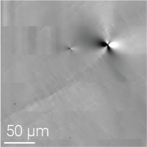 Full wafer scans of a multiple quantum well sample highlight some features unique to these samples. For one, thickness variations in the substrate lead to Fabry-Perot fringes in the wafer image. Secondly, many of the defects in the wafer manifest themselves through bright emission properties. The provided wafer excerpt has a diameter of 2″, though wafers of up to 6″ can be scanned with sub-10 um resolution. Moreover, we offer the option to provide high-resolution images of certain defect areas, as illustrated below.