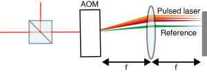 Whenever ultrafast laser pulses are used, careful treatment of temporal and spatial chirp is necessary. Spatial chirp in collinear setups is caused by a wavelength-dependent diffraction angle of the acousto-optic modulators (AOMs). Additionally, the reference laser does not leave the AOM collinear with the pulsed laser. Fortunately, there is an easy solution to this: Double-passing the AOMs.