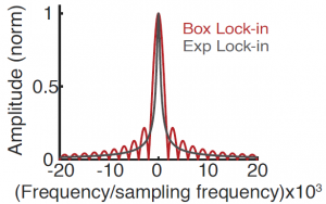 As time constants become shorter for rapid imaging, the conventional (“Exp lock-in”) does not efficiently suppress those extraneous modulations because it transfer function in the frequency-domain, shown in the figure on the right, broadens. Naturally, especially when these modulations are significantly stronger than the actual signal, the extraneous modulations break through and contaminate the image, as can be seen in the comparison of the two lock-ins above, With the MONSTR Sense lock-in (“Box lock-in”), these modulations can be placed in the notches of the transfer function, yielding superior suppression by orders of magnitude.
