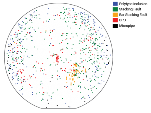 For making devices in SiC, defects of interest in SiC substrates are primarily crystallographic defects that propagate, including dislocations, stacking faults (SFs), and micropipes (MPs). Highly localized defects such as point defects and voids are sometimes interesting, but less critical if they will not propagate into an epitaxial killer defect. Within the set of dislocations there are threading-screw dislocations (TSDs), threading-edge dislocations (TEDs), and threading-mixed dislocations (TMDs), all of which exist along the crystallographic c-axis. Basal plane dislocations (BPDs) exist in the basal plane, normal to the c-axis. Substrate manufacturers are expected to quantify the density of each of these defects to grade wafers, and to help predict eventual device yield on the wafer.