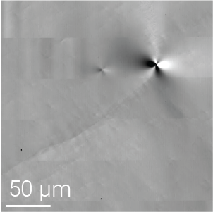 In the figure below, a map of TED and TMD density of a full wafer is plotted in a). Detection algorithms detect the individual defects, and the density is calculated from those detections. Image b) reveals a high-contrast MP in the PLA channel, and many lower contrast features lined up in a row, which corresponds to a TED cluster. Image c) shows BPDs detected using the TA channel.